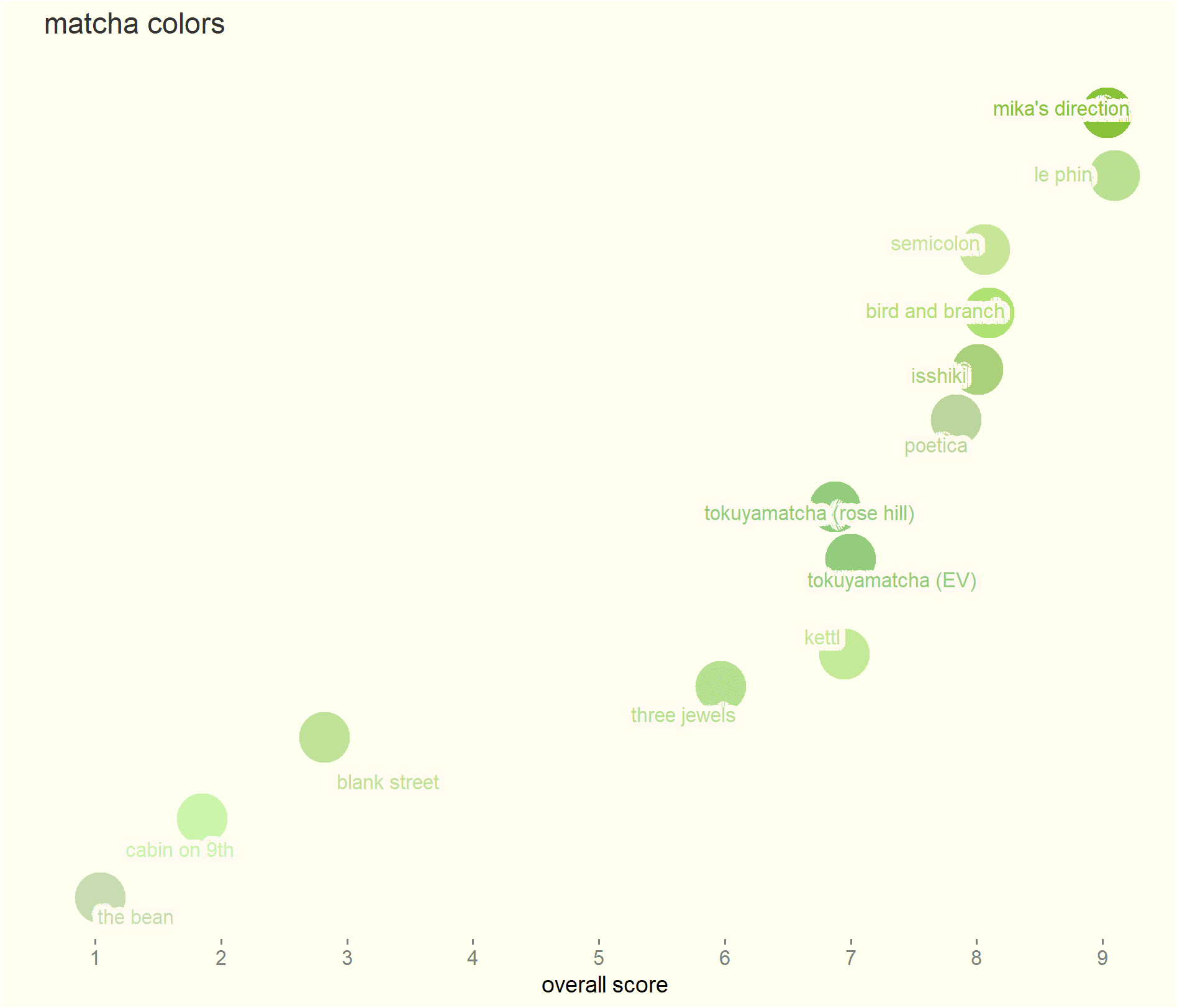 my general rule of thumb is that the darker and more vibrant the green of my matcha latte is, the richer the taste. i prefer a very robust but not bitter taste, only achievable with quality matcha powders. this can also depend on the milk used and who makes the latte, so this is an oversimplification (esp w arbitrary y axis), just for fun :)