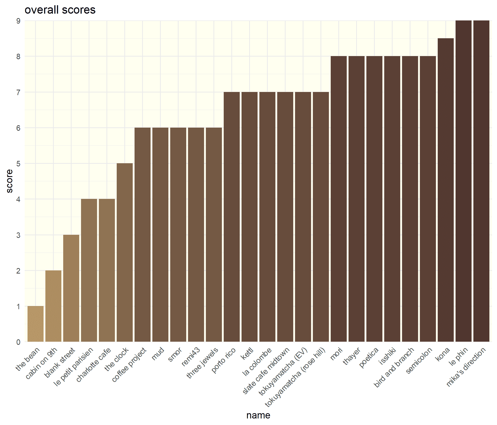 semicolon: very creative matcha lattes! spacious interior, with a loft. genuinely great spot to do work